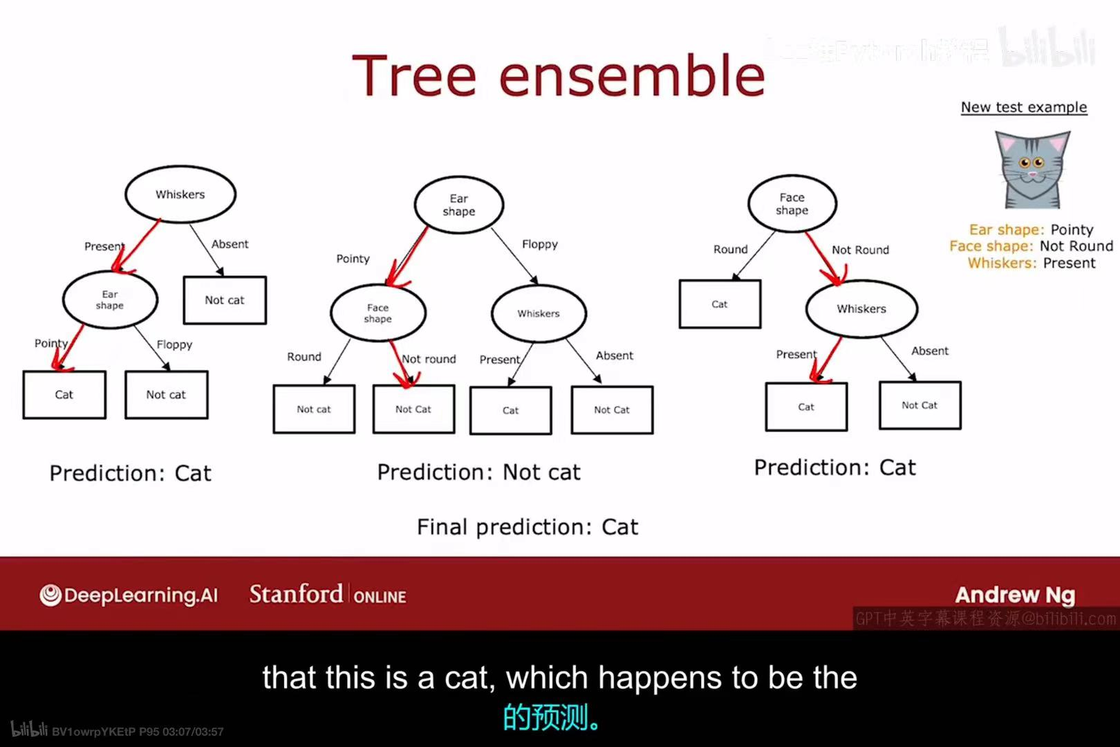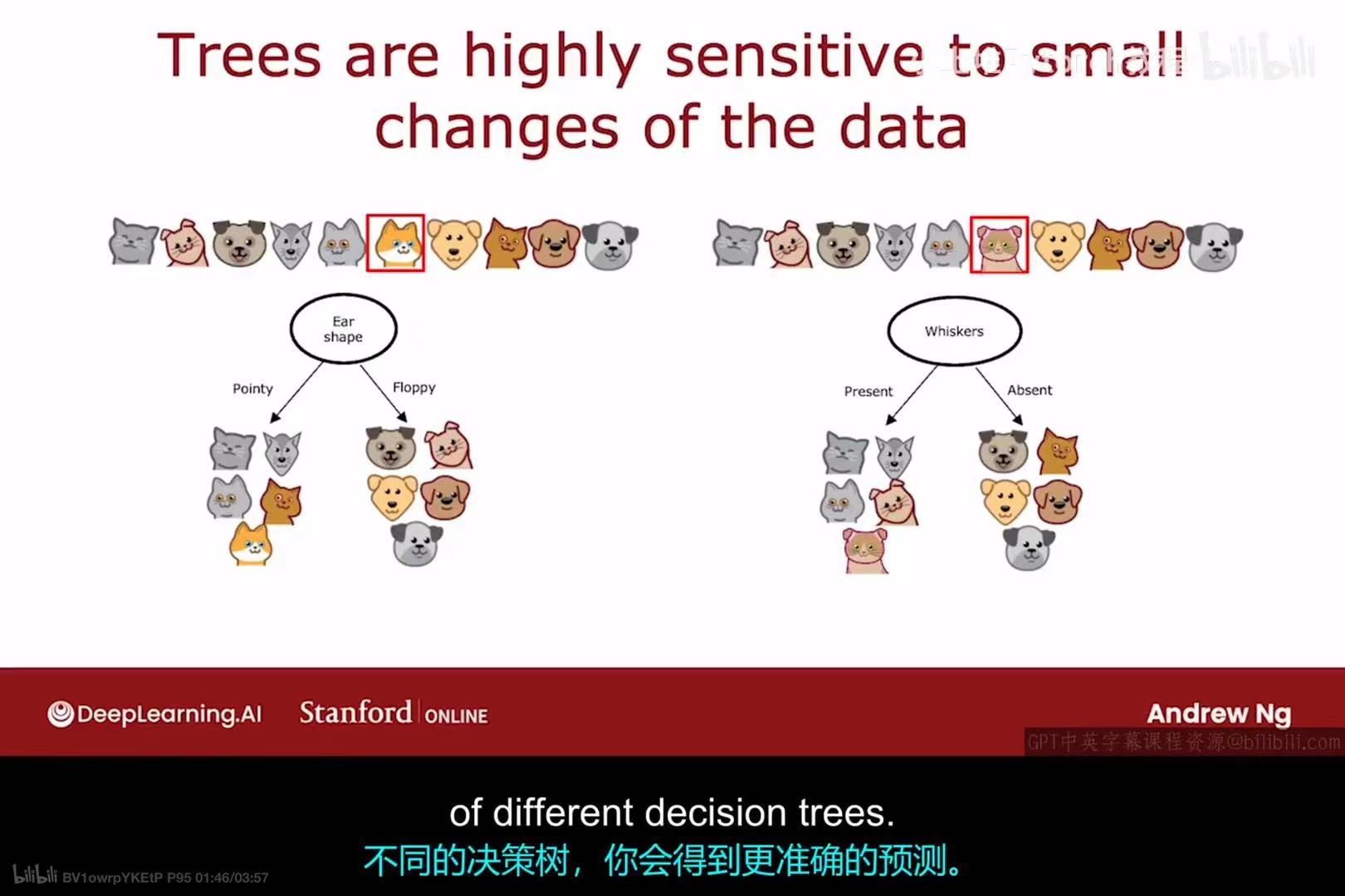 单个决策树有一个显著的缺点:它们对训练数据中的微小变化高度敏感 。如上图所示,仅仅改变一个训练样本的标签(从猫变成狗),就可能导致学习算法构建出一棵结构完全不同的决策树。这种不稳定性是模型高方差(high variance的表现。