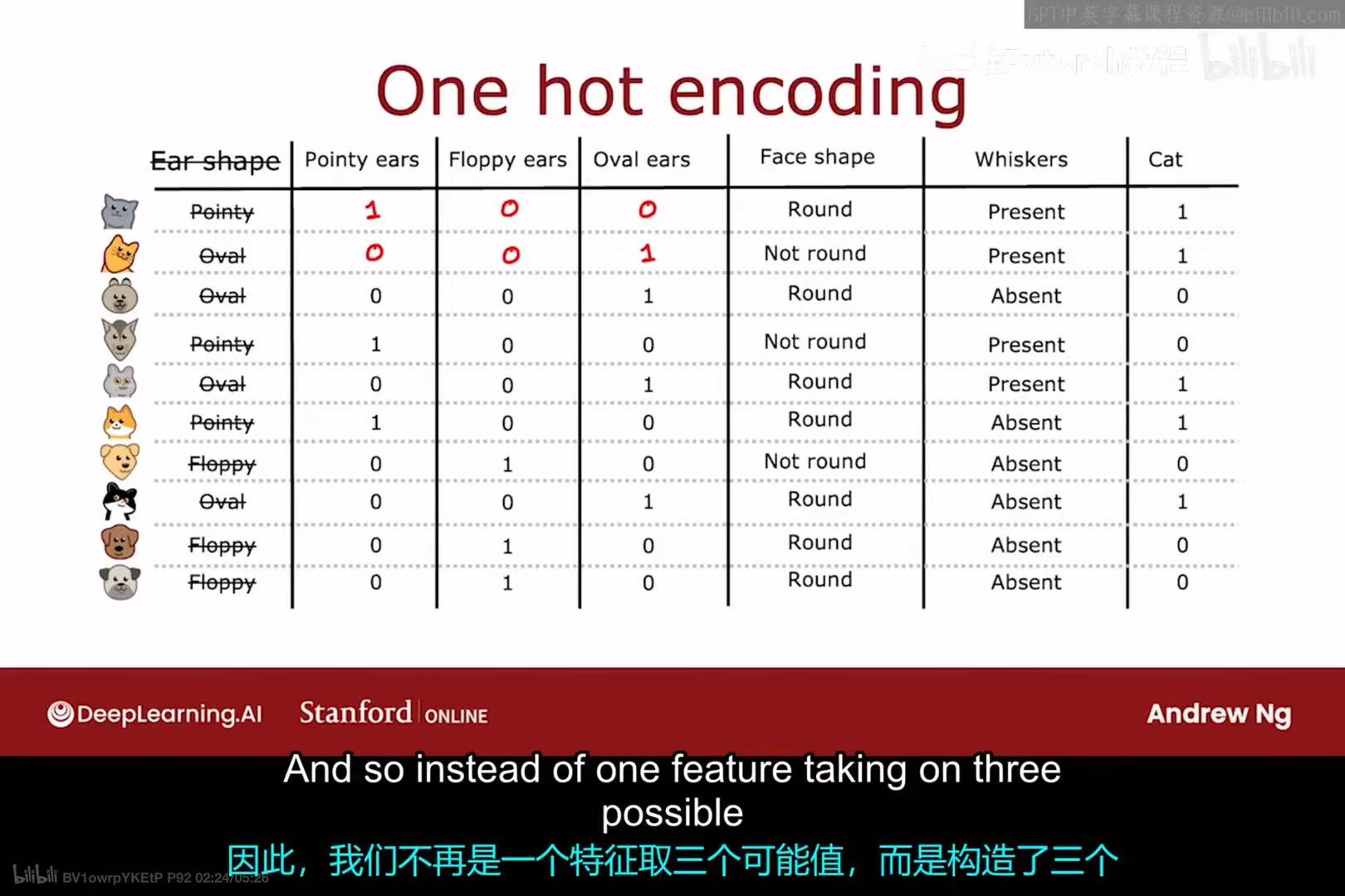 - 第二行样本的耳朵是"Oval",所以在新特征中,"Oval ears"为1,其余两个为0。