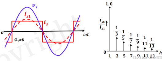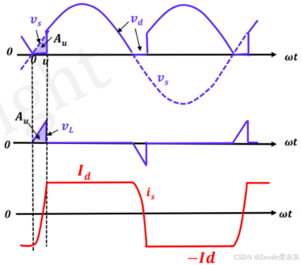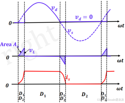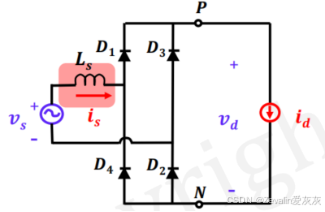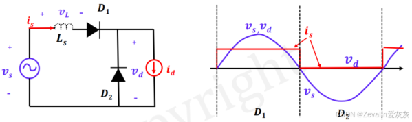 首先分析二极管整流半桥电路,理想情况下,假定输入侧的电感感值为0,那么不难得出输入输出波形如下图所示,电路只存在两个状态------仅D1导通和仅D2导通,电流的换向是瞬间的,不存在第三个状态