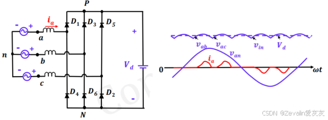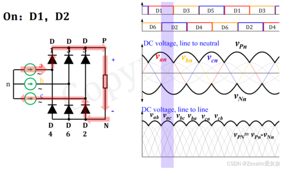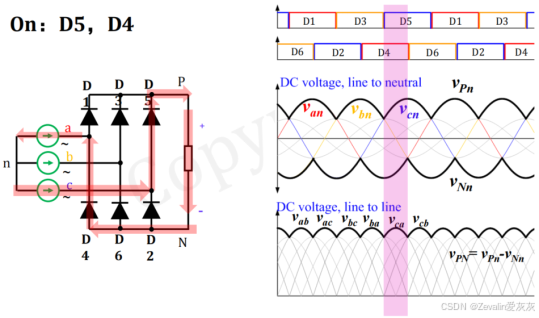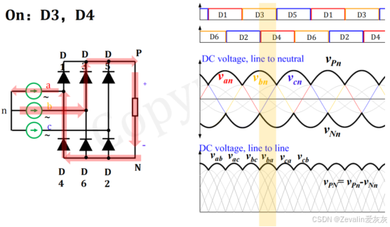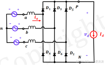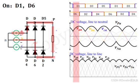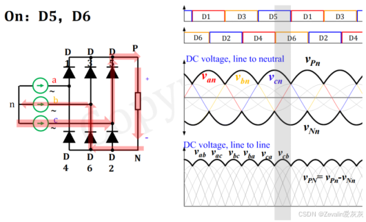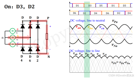 将电路中的二极管分为两组,D1、D3、D5轮替导通,D2、D4、D6轮替导通,原则为P点连接(即与之导通)三相电中电势最高的点,N点连接(即与之导通)三相电中电势最低的点,具体可回顾《模拟电路》中多二极管并联的分析方法