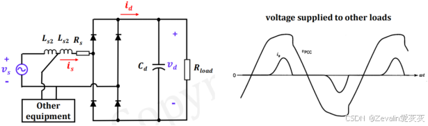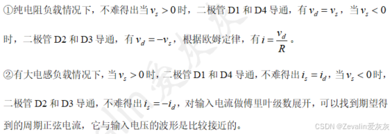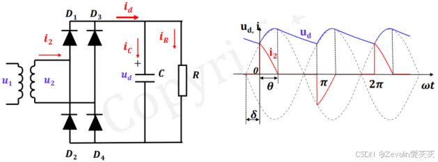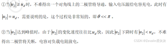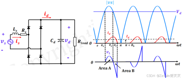 (2)下图所示的是带电容负载的二极管整流全桥电路原理图及其输入输出波形,与上面不同的是,此处暂不考虑输入侧寄生电感和寄生电阻的影响,讨论的电容负载其容值并非无穷大,那么电容电压的纹波便会影响二极管的导通状态。