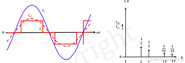 有大电感负载情况下,对输入电流做傅里叶级数展开,可以找到期望得到的周期正弦电流,相比于单相半波整流器,三相全桥整流电路的正弦电流波形更加契合输入电压,也就是说,供电的质量更高了