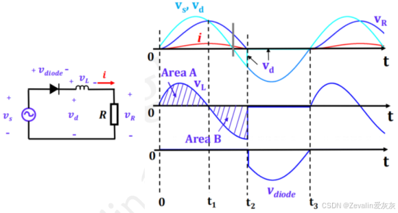 (1)当负载是电感与电阻串联时,单相半波整流器原理图及其输入输出波形如下图所示。