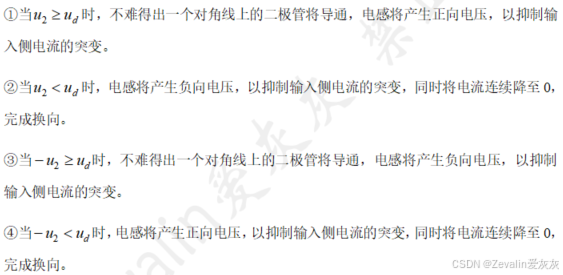 二极管整流半桥电路的结果可推演到二极管整流全桥电路中,如下图所示,主要原则就是电感电流不能突变,它会阻碍的瞬间换向,形成一个"缓冲"