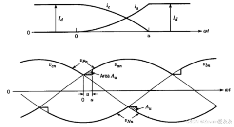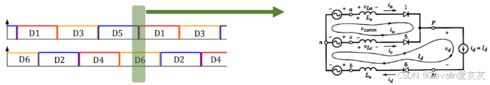 以D5、D6导通切换到D1、D6导通为例,根据经验,不难得出电流换向过程中D5和D1会同时导通,D5上的电流逐渐减小,D1上的电流逐渐增大
