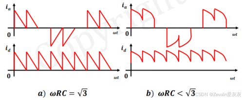 (3)容性负载的三相全桥整流电路有一个边界,当超过这个边界时,三相输入电流及输出电流的波形将产生交叠,如下图所示。
