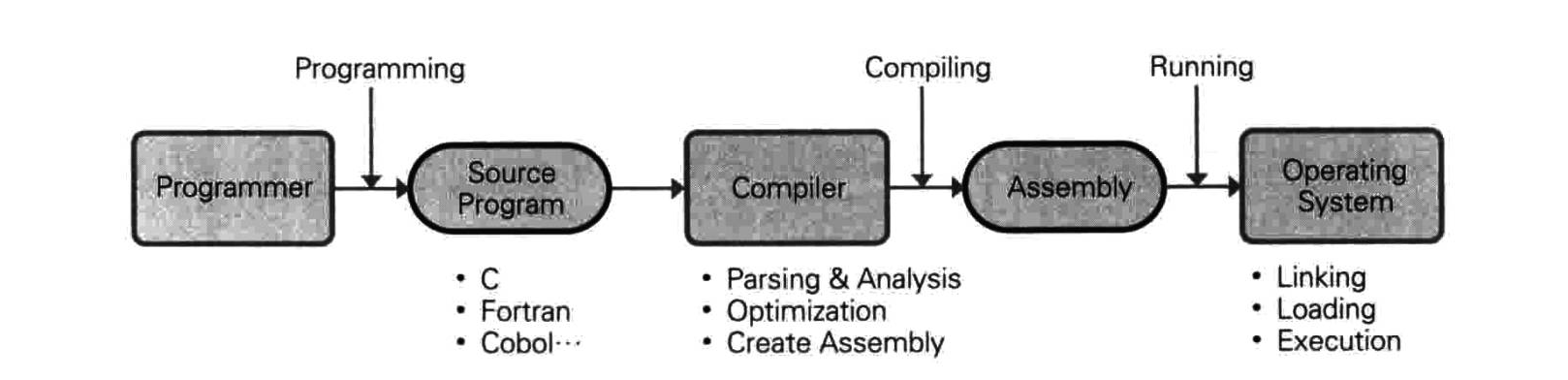 下面以编译型语言为例进行介绍。编译器用于将源代码转换为目标代码,此过程中并非只进行简单转换,还要对代码进行并行化处理,以便在多核环境中优化。此外还要分析代码,显示代码中的错误信息。一般而言,目标代码是汇编代码。汇编代码以人类易读的形式表示机器代码,它与机器代码是一一对应的。编译完成后,用户即可运行程序。用户双击可执行文件时,操作系统会将其加载到内存,并连接需要的 DLL 与库。如前所述,运行程序时,程序数据会被加载到代码、数据、BSS 区域,并分配运行所需的堆区域与栈区域。