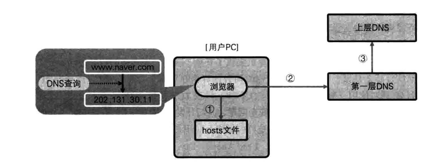 比如,在浏览器地址栏输入网址www.naver.com后,程序首先会在系统的 hosts 文件中搜索已有的域名与 IP 地址。假设查找到记录为 140.100.90.9 www.naver.com,则浏览器会将 140.100.90.9 识别为 IP 地址,并进行连接请求 Web 服务。hosts 文件通常只用于测试,浏览器一般会在第一层 DNS 中查找域名对应的 IP 地址。一个全新的域名可能不存在于第一层 DNS,此时第一层 DNS 会向第二层 DNS 发送目录更新请求,更新自身数据库后,将相关 IP 地址发送给用户 PC。