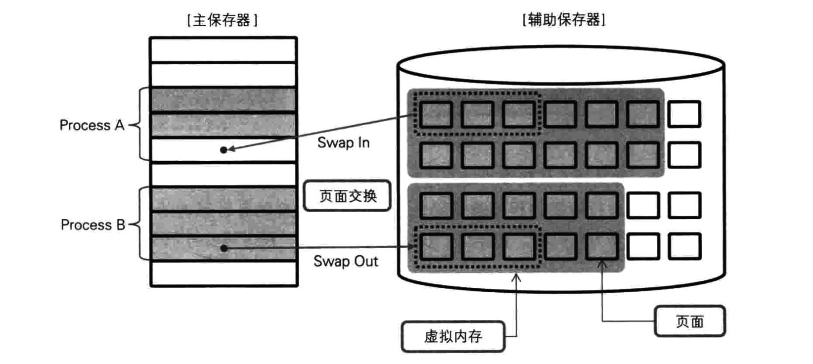 虚拟内存技术中,主保存器与辅助保存器虚拟绑定,看起来就像是在使用同一块内存一样。要做到 "无中生有",必须使用各种管理技术,如下所示。