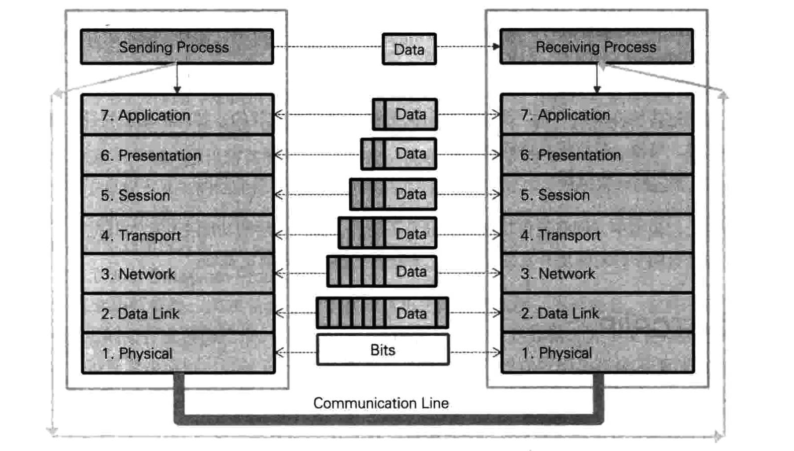 OSI 七层模型是国际标准化组织(ISO)为解决所有网络通信中出现的问题而制定的开放系统互联参考模型。事实上,并非所有网络设备都严格按照 OSI 七层参考模型制造并区分功能,但 OSI 七层模型提供了进行学术研究与理解网络工作原理必需的概念。从第一层到第七层,各层功能区分很明确。数据自高层向低层移动时,在各层不断添加相应的头部与尾部。与之相反,数据包自低层向高层移动时,依次去除各层头部与尾部。数据包头部与尾部分别包含各层所需的元信息,这些信息组合成为通信协议。下面逐层介绍 OSI 七层模型。