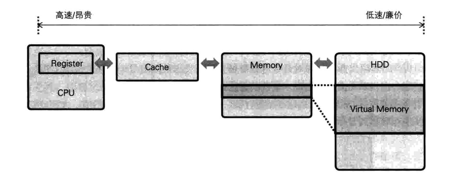 第二,数据保存设备。CPU 工作时需要从内存读入命令与数据,并进行处理。为此,必须先将 HDD 中的应用程序加载到内存。内存的作用类似于 CPU 的工作场。内存容量越大,一次性处理的事务就越多,所以增加内存容量有利于提升计算机处理性能。事实上,将应用程序运行时要使用的所有数据全部加载到内存几乎是不可能的。为了解决这一问题,人们开发了虚拟内存技术。使用虚拟内存能够大大提高内存的使用效率,但虚拟内存技术也为计算机性能带来诸多问题。将 HDD 中的数据加载到内存、CPU 从内存读入数据的过程中,各阶段都有可能出现性能低下。为了解决这一问题,人们引入缓存技术,将常用数据保存到 CPU 的高速缓存。