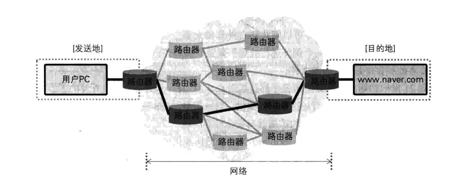 用户 PC 访问 Web 服务时,首先要通过 DNS 服务器查找 Web 服务器的 IP 地址,然后决定走哪条路到达目的地。出发地是用户 PC 连接的本地路由器。本地路由器查找自身路由表,搞清目的路由器所在位置。若在自身路由表中查找不到与目的路由器有关的信息,则向邻近路由器询问。如此反复,最终找到一条到达目的地的最优路径,然后发送数据包。