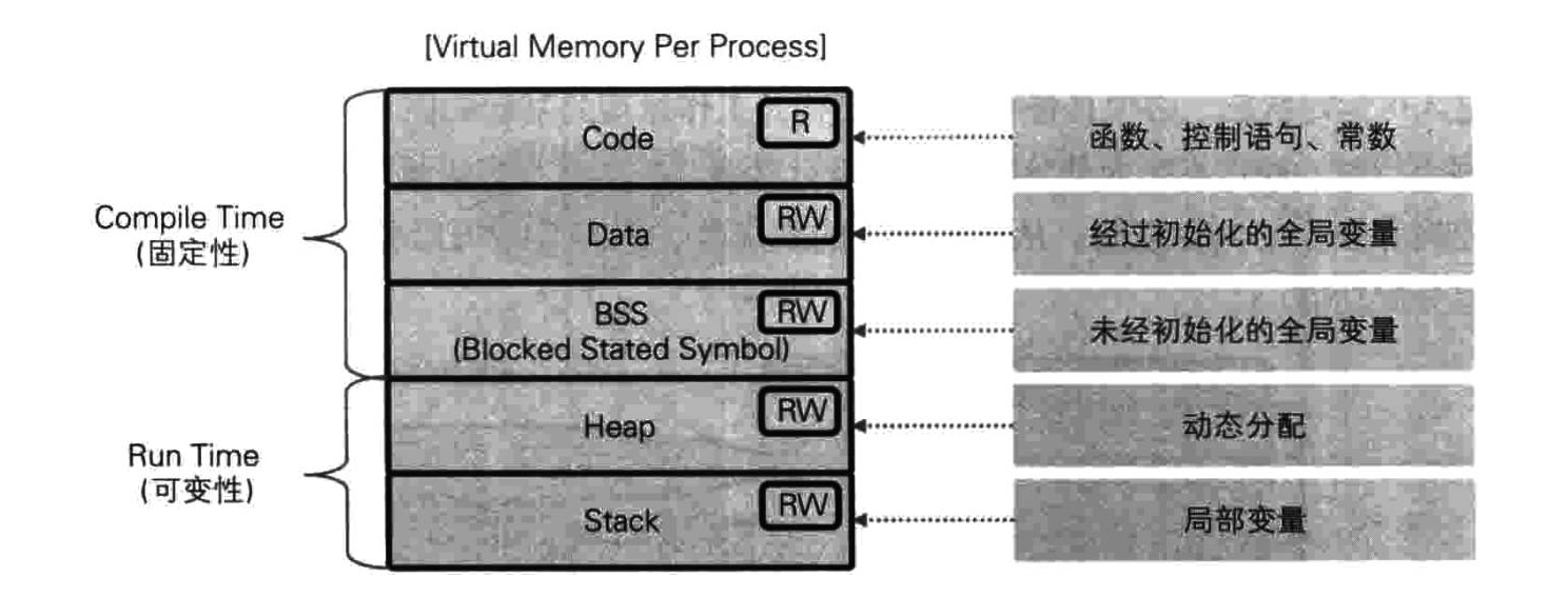 一般而言,计算机中使用的内存可以分为 ROM 与 RAM 两种。ROM 是一种非挥发性内存,用于保存有关计算机启动时的设备检查与从 HDD 加载引导程序(Bootstrap)的基本信息。RAM 是计算机运行中使用的内存,进程使用的数据就保存于此。RAM 是一种高速的挥发性保存设备,只在电源接通时才能保存数据。