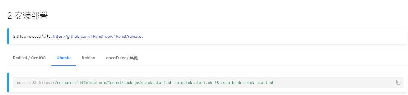 PS:如果想在终端中使用命令行安装,大家可以访问1panel的官网:https://1panel.cn/docs/installation/online_installation/ 选择自己服务器的系统,复制命令行进行安装。安装过程中会提示设置账号密码与端口等信息。