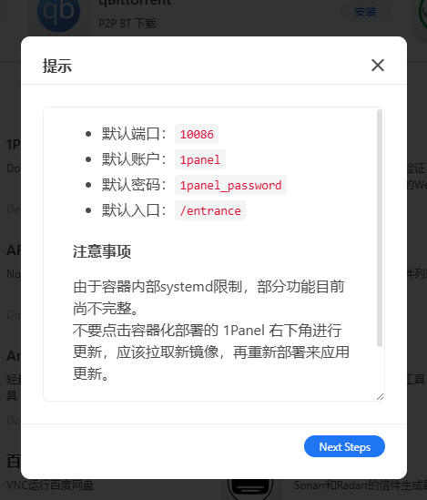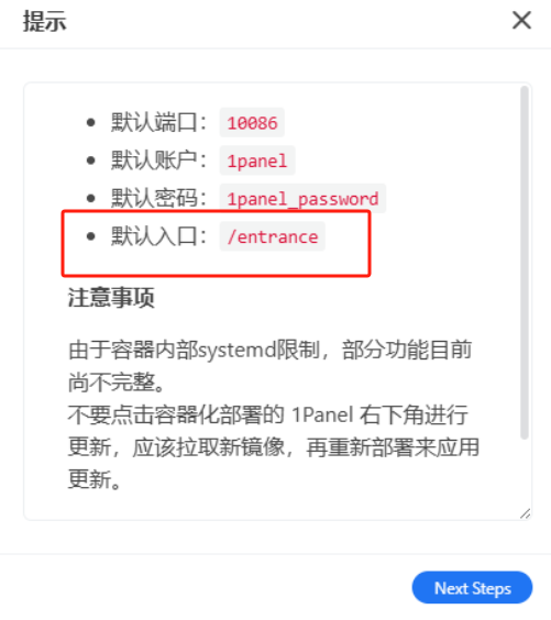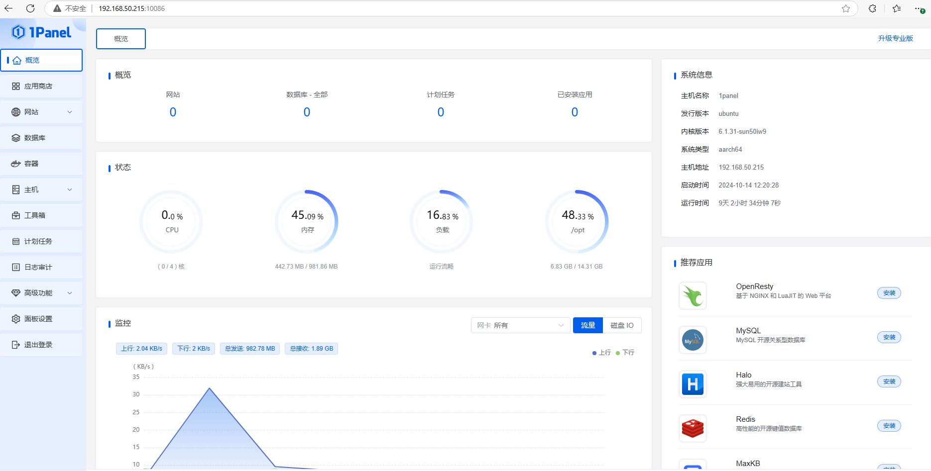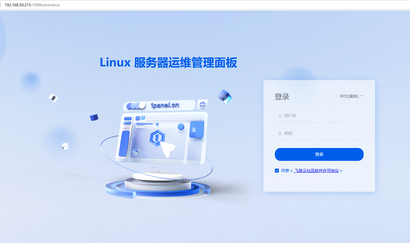 部署完成后,点击打开,即可在浏览器中访问1panel面板的web登录界面: