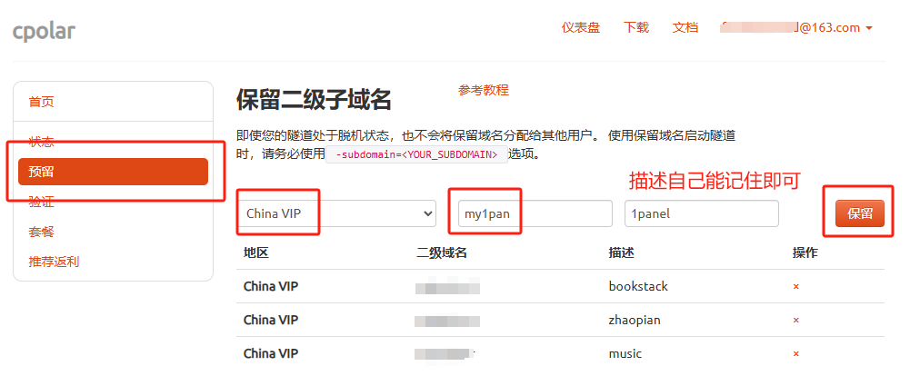 登录cpolar官网,点击左侧的预留,选择保留二级子域名,地区选择China VIP,设置一个二级子域名名称,点击保留,保留成功后复制保留的二级子域名名称,这里我填写的是 my1pan ,大家也可以自定义喜欢的名称。