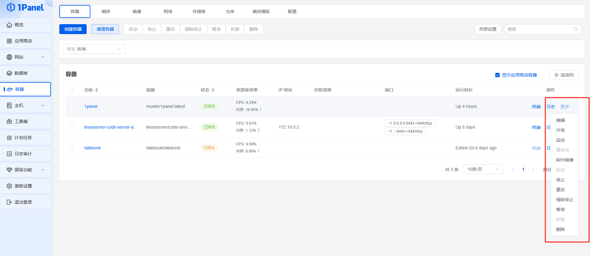 而在容器菜单中,可以像在portainer中一样管理docker容器,而且支持中文,确实体验更好。