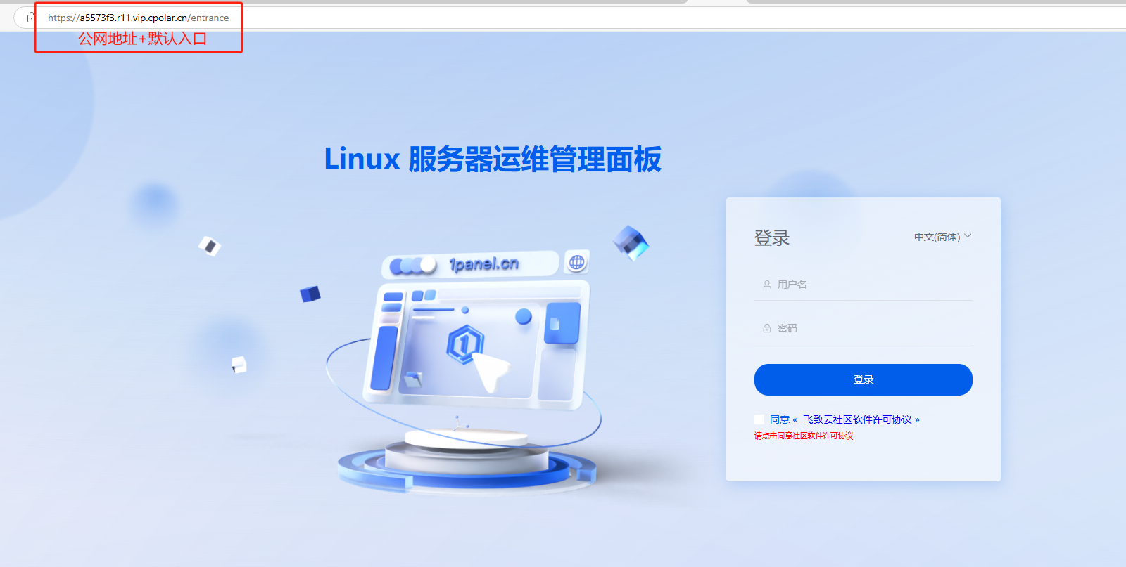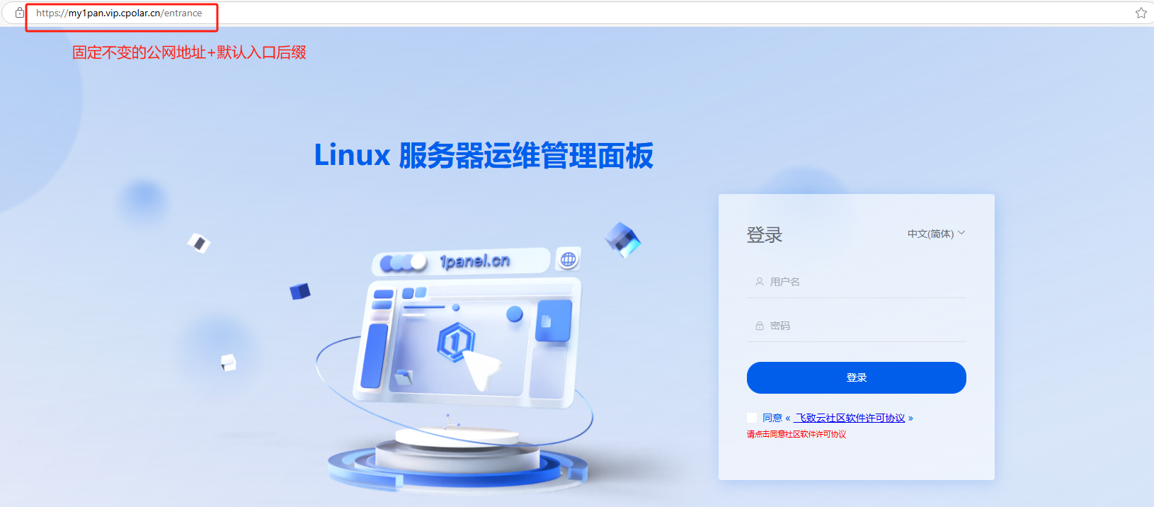 在浏览器访问,可以看到访问成功,这样一个固定且永久不变的公网地址就设置好了,随时随地都可以远程访问本地局域网内的casaos香橙派主机端中1panel面板了!