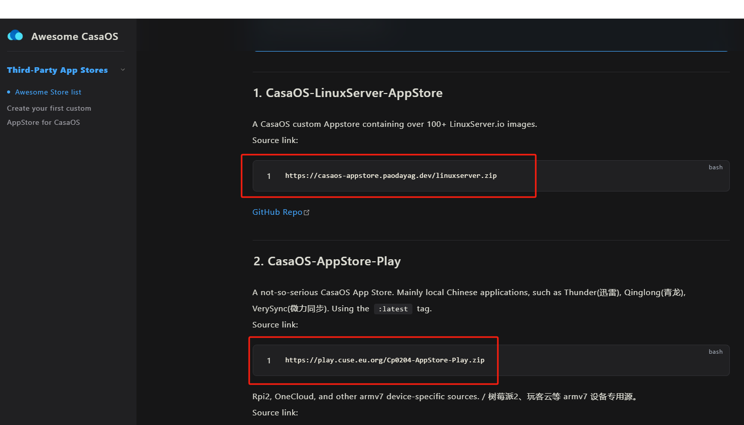 复制这个页面中的这些地址,然后回到CasaOS应用中心界面。