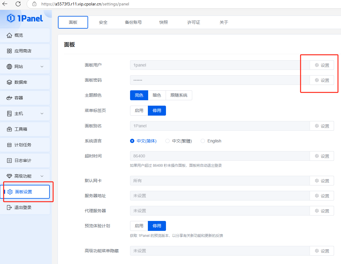 如果想要修改登录面板的账号密码,可以在面板设置中进行修改: