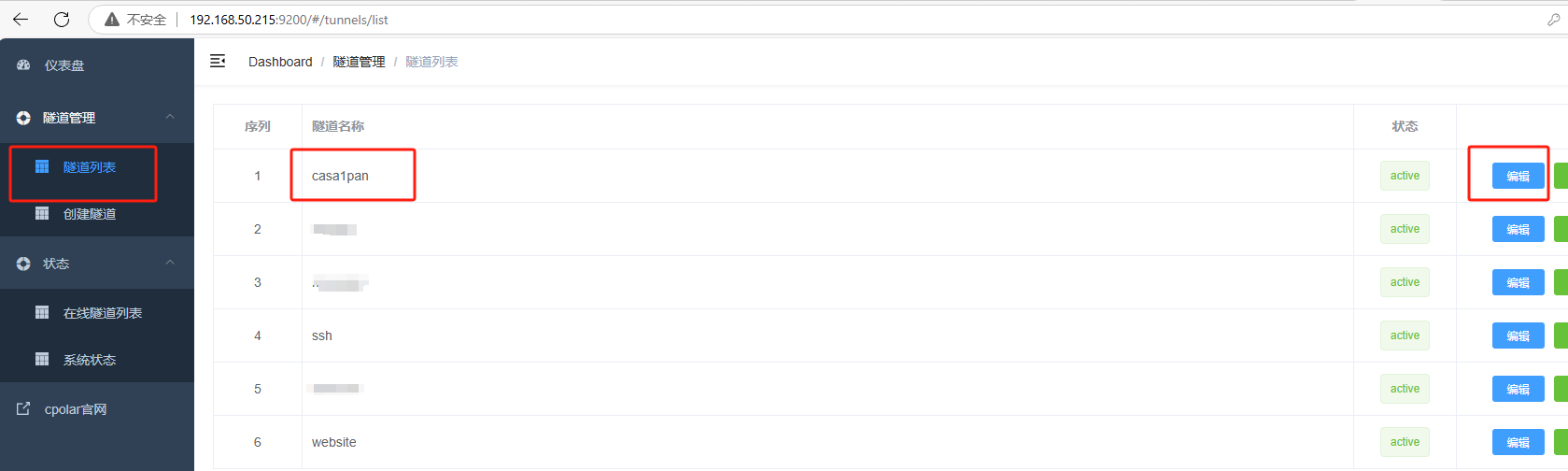 保留成功后复制保留成功的二级子域名的名称: my1pan ,返回登录Cpolar web UI管理界面,点击左侧仪表盘的隧道管理------隧道列表,找到所要配置的隧道 casa1pan,点击右侧的编辑: