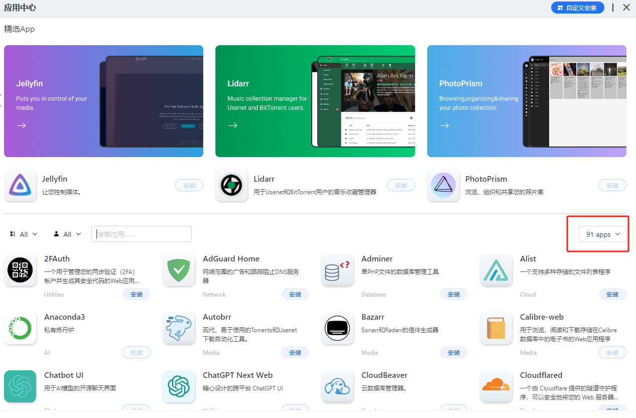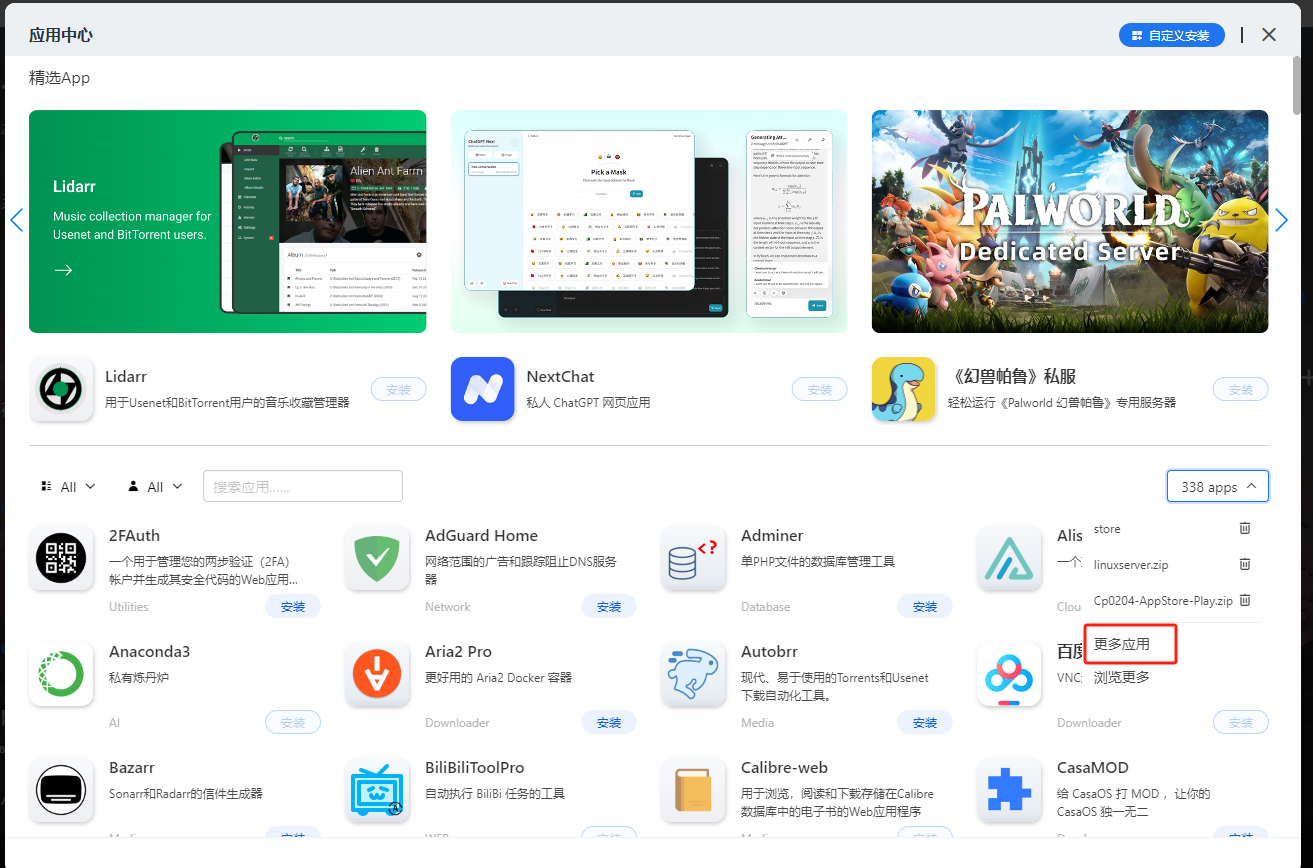 刚安装casaos系统会发现里边的应用太少了,其实官方是给出了手动添加更多应用的方法的,只要点击目前APP下拉框中的更多应用。