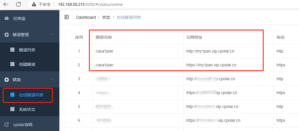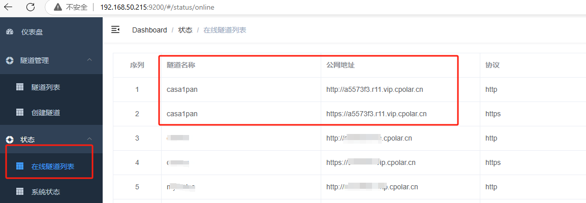 更新完成后,打开在线隧道列表,此时可以看到公网地址已经发生变化,由随机地址名称变成了两个固定的二级子域名(固定公网地址):