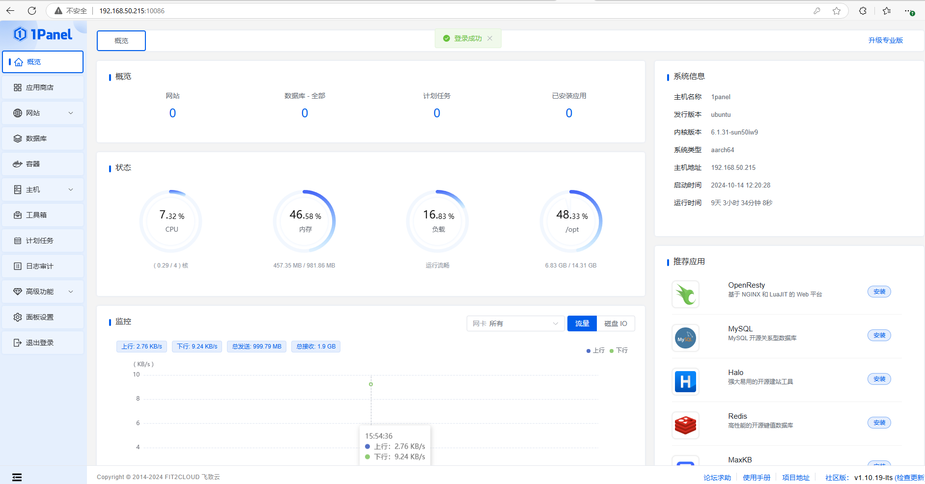 登录刚才使用的账号密码后,我们就可以使用手机、平板等设备在浏览器成功远程访问本地casaos香橙派zero3中部署的1panel面板的Web管理界面啦!