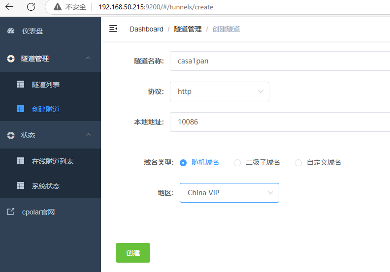 隧道名称:可自定义,注意不要与已有的隧道名称重复,本例使用了:casa1pan