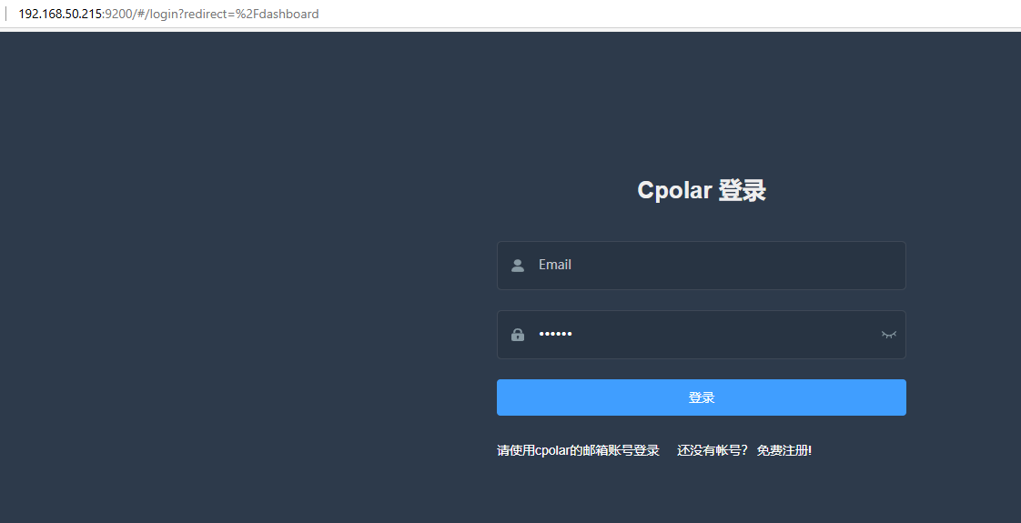 然后我们使用CasaOS香橙派的IP地址加上9200,打开一个新的浏览器来登录cpolar管理界面 :