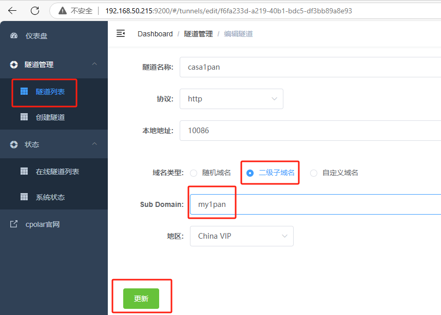 修改隧道信息,将保留成功的二级子域名配置到隧道中