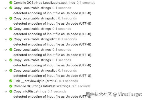 - Xcode 会自动开始迁移过程。为了完成此过程,您可能需要 构建项目 (Cmd+B),Xcode 会在构建过程中收集项目中的字符串资源到 .xcstrings文件中。