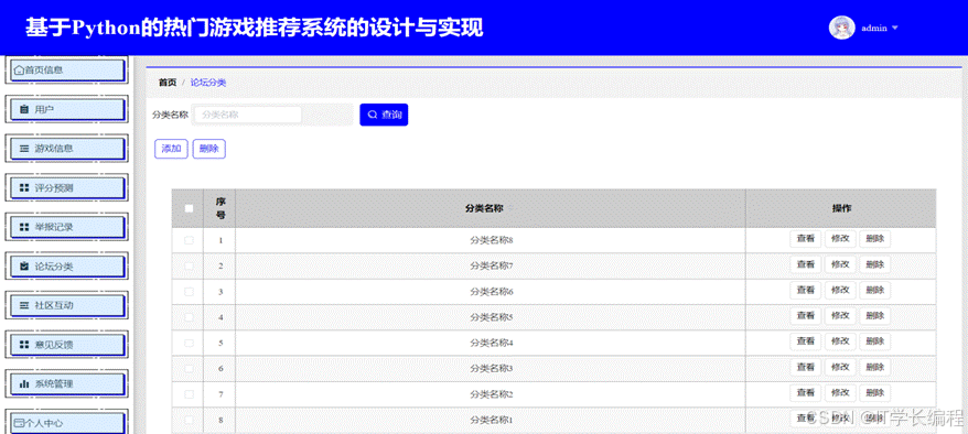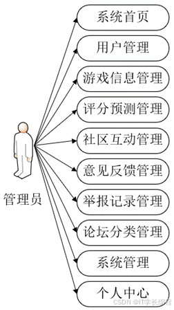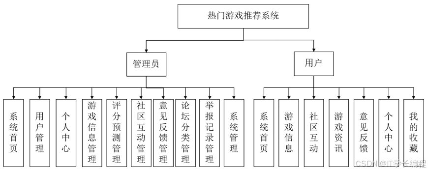 热门游戏推荐系统的整体架构分为管理员和用户两大功能模块,旨在满足不同用户群体的需求。管理员模块包括系统首页、用户管理、个人中心、游戏信息管理、评分预测管理、社区互动管理、意见反馈管理、论坛分类管理以及举报记录管理等功能,为管理员提供了全面的后台管理能力,确保系统内容的更新、用户互动的监管以及系统的正常运行。用户模块则包括系统首页、游戏信息、社区互动、游戏资讯、意见反馈、个人中心和我的收藏等功能,使用户能够方便地浏览游戏信息、参与社区讨论、获取游戏资讯、提供反馈以及管理个人收藏。这种模块化设计不仅提高了系统的可维护性和扩展性,也确保了不同用户角色能够便捷地访问所需功能,从而提升整体的用户体验和系统运营效率。系统模块功能结构如图3-1所示:
