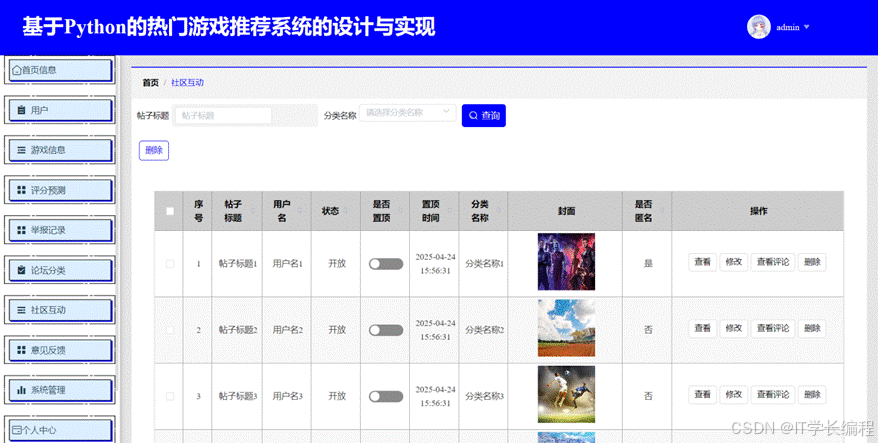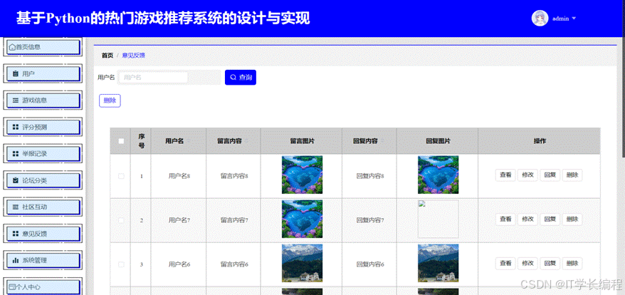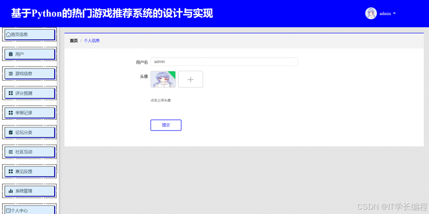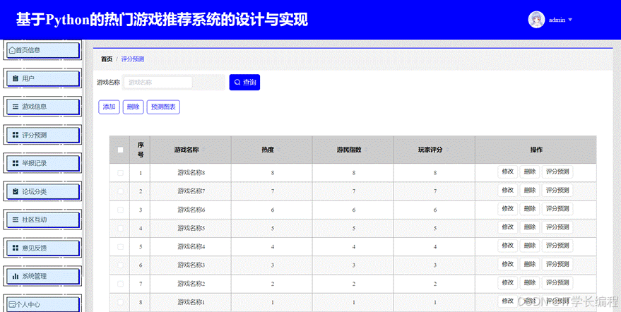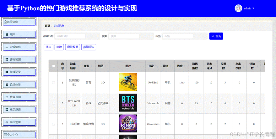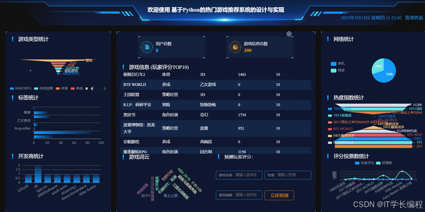 本项目是一个基于Python的热门游戏推荐系统,旨在为游戏爱好者提供个性化的游戏推荐服务。系统通过分析用户的浏览历史、评分偏好、社区互动等行为数据,利用机器学习算法生成个性化的游戏推荐列表。此外,系统还设有社区互动模块,用户可以在社区中分享游戏经验、发表意见反馈,增强用户之间的互动和交流。系统的目标是提升用户体验,帮助用户发现更多感兴趣的游戏,同时也为游戏开发者提供用户行为分析,支持更精准的市场定位和产品推广。