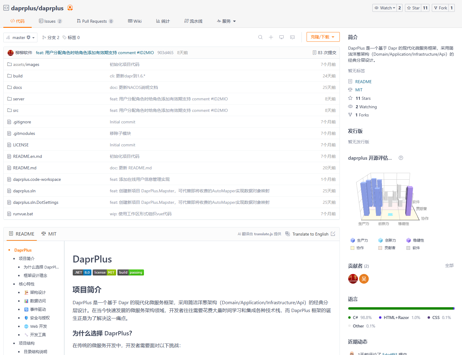 项目描述:DaprPlus是一个基于Dapr的现代化微服务框架,采用简洁清晰的领域驱动分层架构(Domain/Application/Infrastructure/Api),通过经典的分层设计实现业务逻辑与技术实现的解耦,在保持系统可维护性和扩展性的同时,为复杂业务场景提供结构化的解决方案。