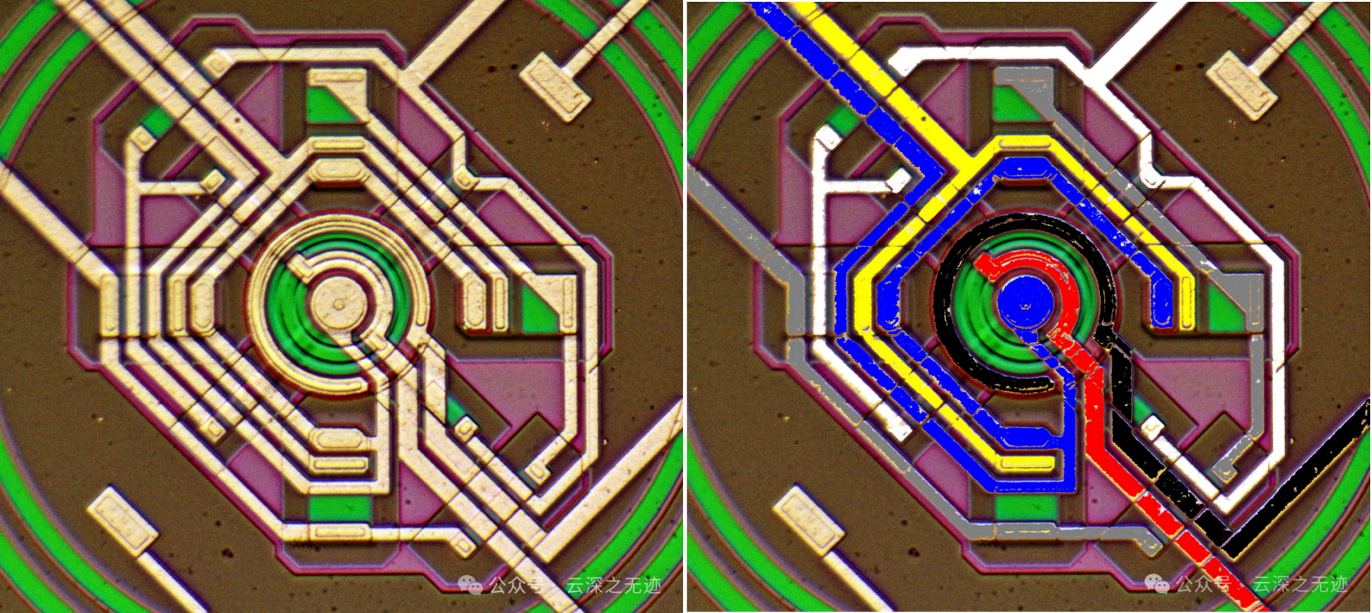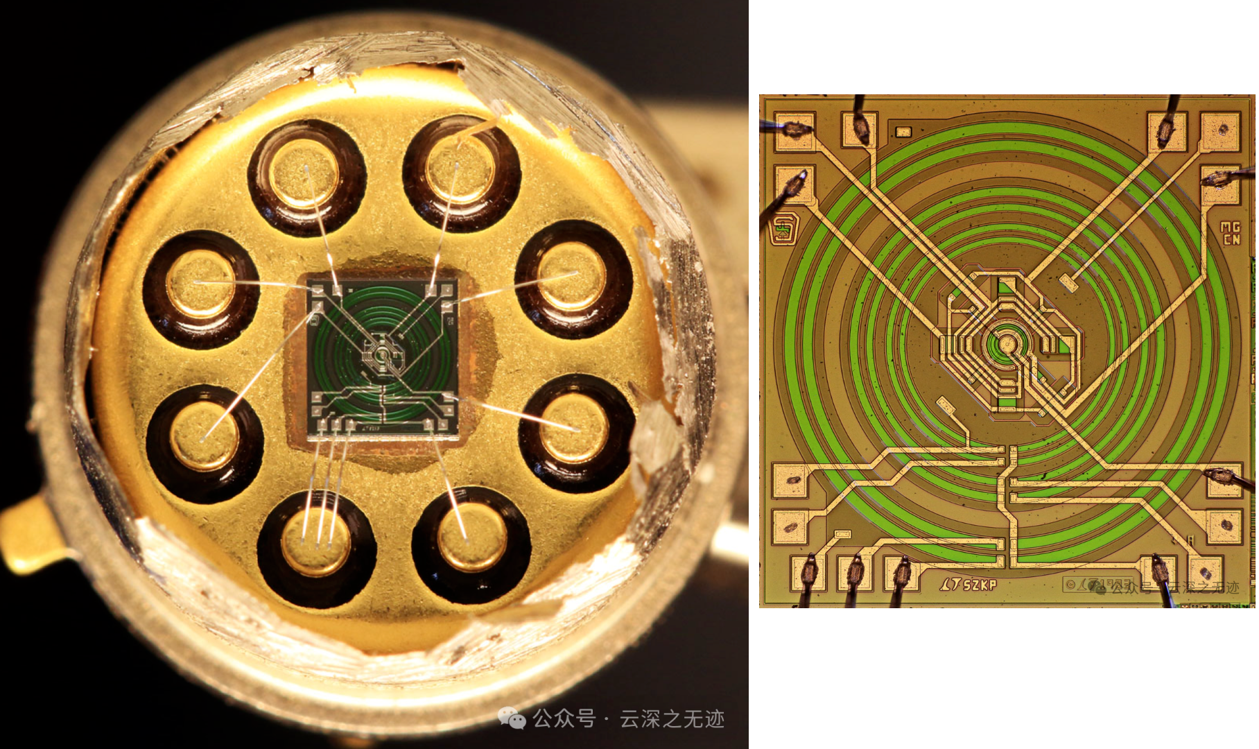 右上角另有一块基板接触垫,用于监控加热均匀性。这些环状加热结构能实现极低的温度梯度(≈0.01°C),确保齐纳与晶体管在完全一致的温度下工作。