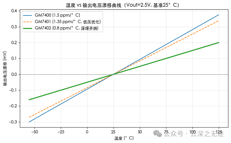 GM7402(0.8 ppm/°C,深埋齐纳架构):曲线几乎水平,全温区漂移仅 ±0.36 mV。