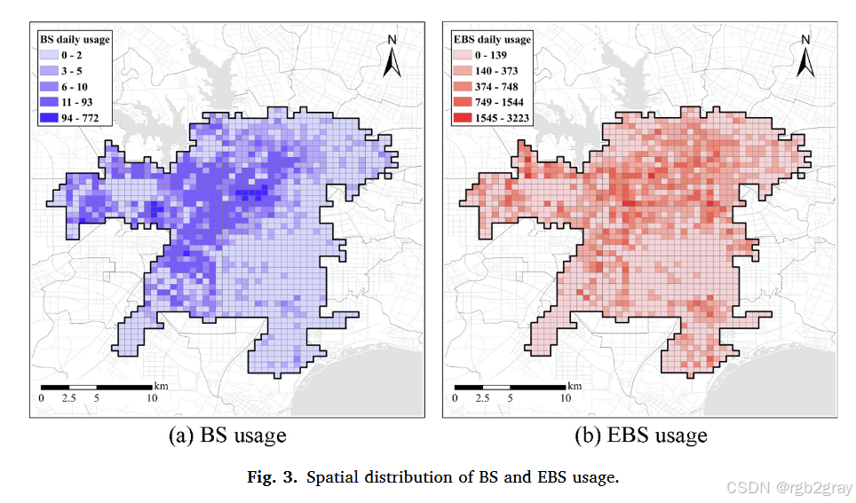图3 BS与EBS使用的空间分布:采用热力图呈现,深色代表高使用率。