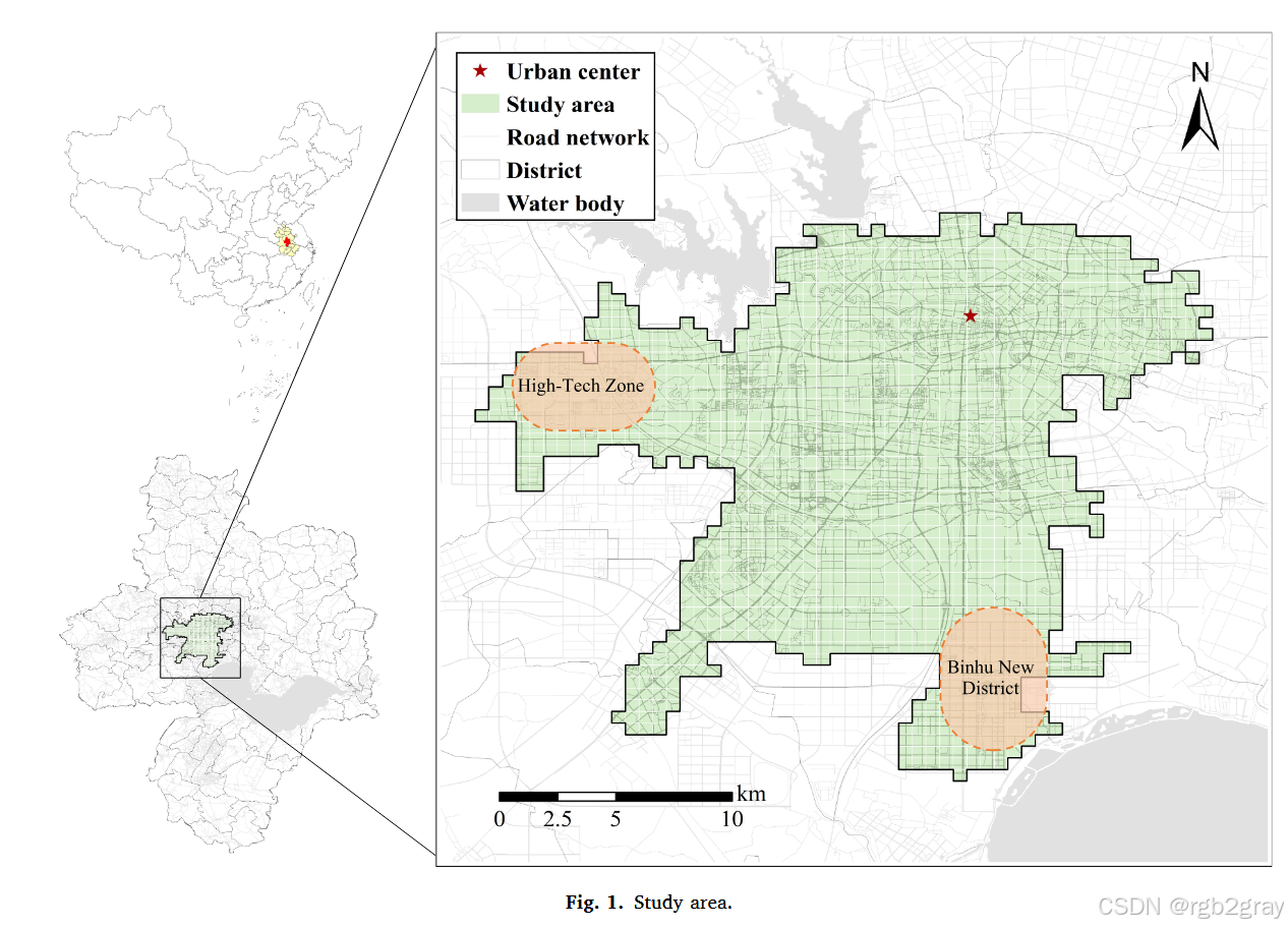图1 研究区域图:图中标注了合肥的市中心、道路网络、行政区界与水体,明确了西部高新区、南部滨湖新区等产业集中区的位置。深色覆盖区域即为BS与EBS服务重叠的分析范围,排除了服务不重叠区域的偏差,确保后续对比分析的空间一致性。