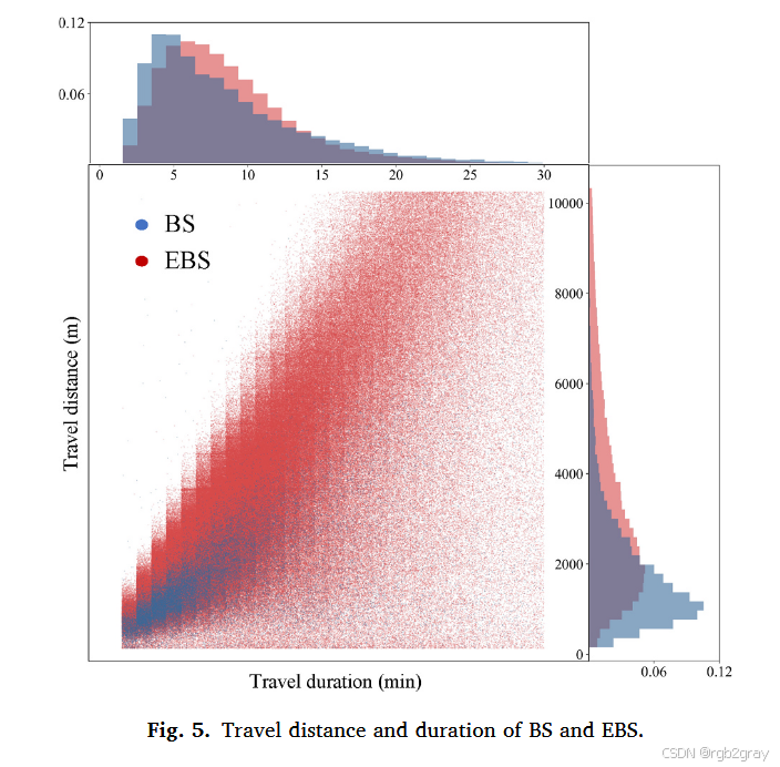 图5 BS与EBS的出行距离(左)和时长(右)分布:蓝色代表BS,红色代表EBS,横轴为距离(km)或时长(min),纵轴为频次密度。