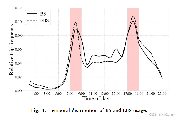 - 差异:EBS高峰时段占比更高(早高峰EBS占比超30%,BS约20%),反映通勤用户对EBS"省时省力"的偏好;BS在非高峰时段(如10:00-16:00)占比更高,兼顾休闲、购物等非通勤需求;EBS在19:00后使用率下降更慢,常用于夜间出行(如聚餐、娱乐返程)。
