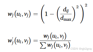 其中:dijd_{ij}dij 是目标数据点 jjj 与空间邻居 iii 的地理直线距离,dmaxd_{max}dmax 是目标点 jjj 所有邻居的最大距离,wj′w_j'wj′ 是归一化后的权重(确保权重和为 1)。该函数的特点是"距离越近,权重衰减越快",符合空间数据的"距离衰减定律"。