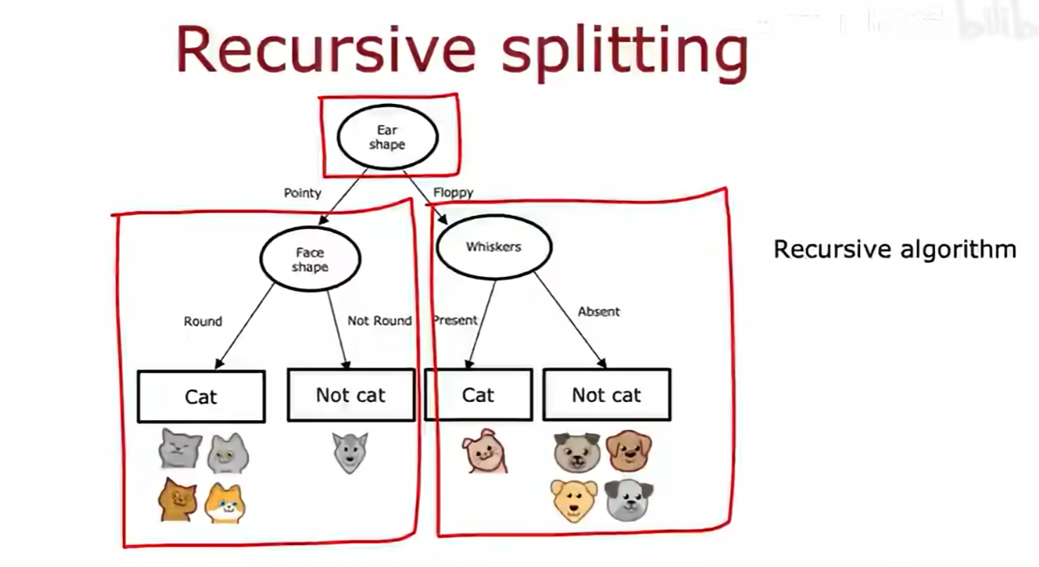 如图所示,在根据"Ear shape"分裂后,算法会对"Pointy"和"Floppy"两个子节点分别应用相同的逻辑,继续寻找最佳分裂特征("Face shape"和"Whiskers"),从而构建出完整的决策树。