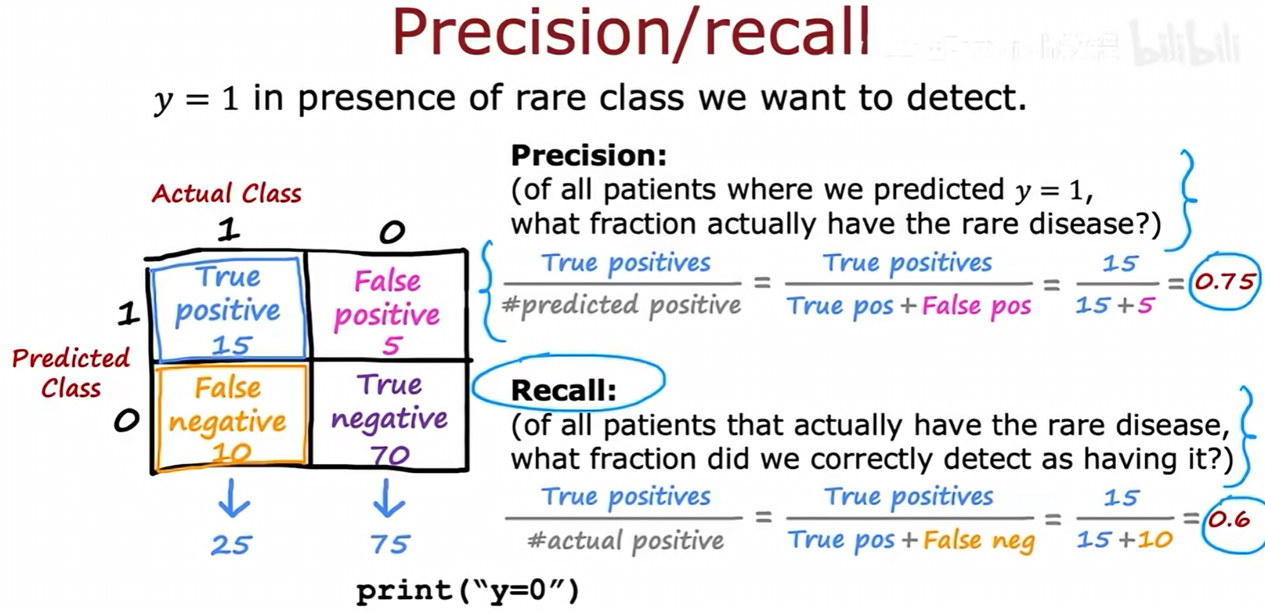 为解决偏斜类别下的评估问题,我们使用精确率(Precision)和召回率(Recall)。这些指标基于一个混淆矩阵(Confusion Matrix),该矩阵展示了模型的四种预测结果:
