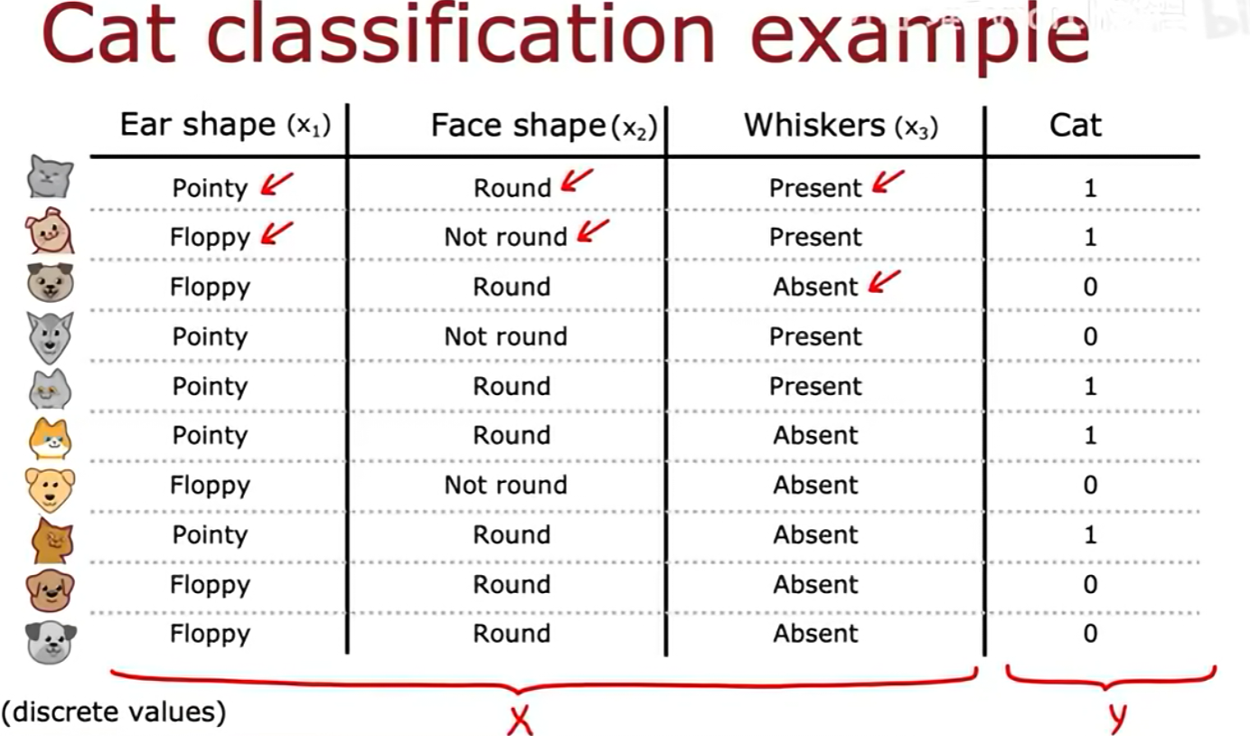 决策树是一种用于分类和回归的模型。以一个猫分类任务为例,输入数据 X 包含三个离散特征:耳朵形状(Ear shape)、脸部形状(Face shape)和是否有胡须(Whiskers)。输出标签 y 为1(是猫)或0(不是猫)。