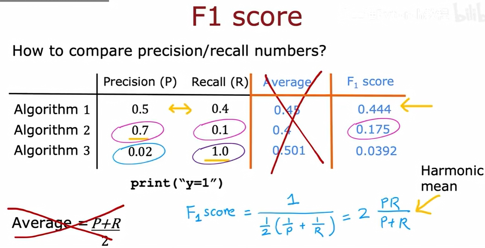 (P+R)/2是不可取的,因为它可能会给一个极端但无用的模型高分(如算法3)。 - F1分数是精确率(P)和召回率(R)的调和平均数(Harmonic Mean)。