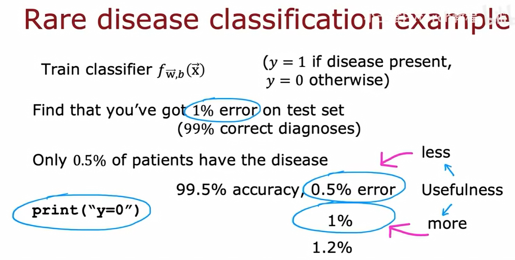 y=0(健康)的程序,其错误率仅为0.5%,准确率高达99.5%。 - 这个结果(0.5%错误率)优于训练好的模型(1%错误率),这表明在偏斜类别问题中,高准确率并不能证明模型的有效性。