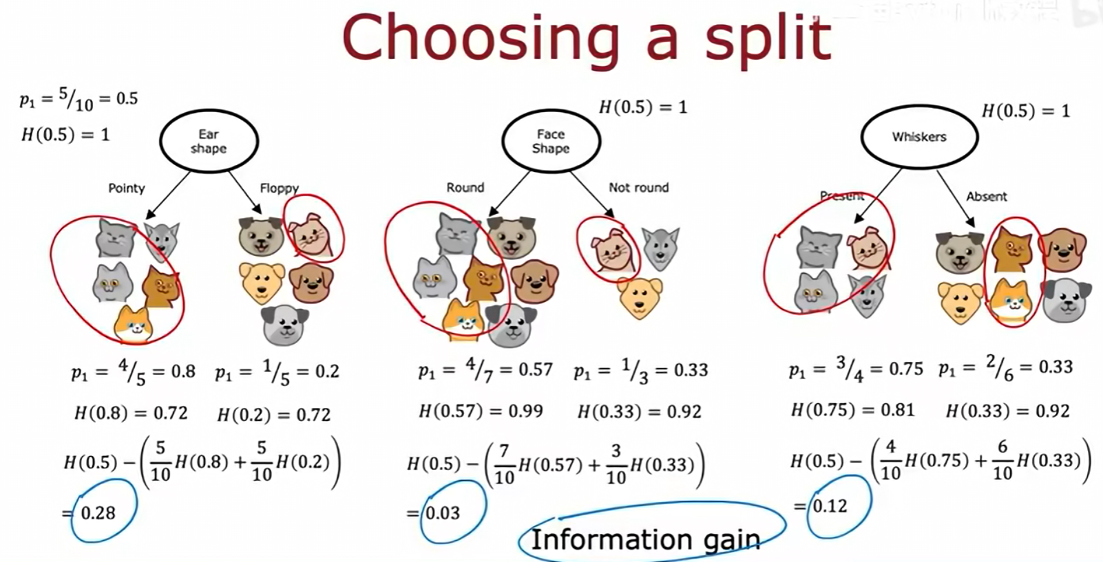 w是每个子节点的样本数占父节点总样本数的比例。 Information Gain = H(p₁_root) - (w_left * H(p₁_left) + w_right * H(p₁_right))