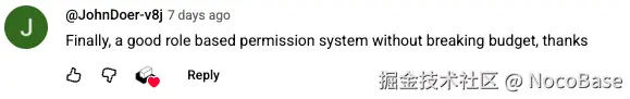 - 用户评价:在 NocoBase 的官方视频评论区中,有用户反馈它的 RBAC (基于角色的权限控制)功能非常强大,同时整体成本也相对可控。