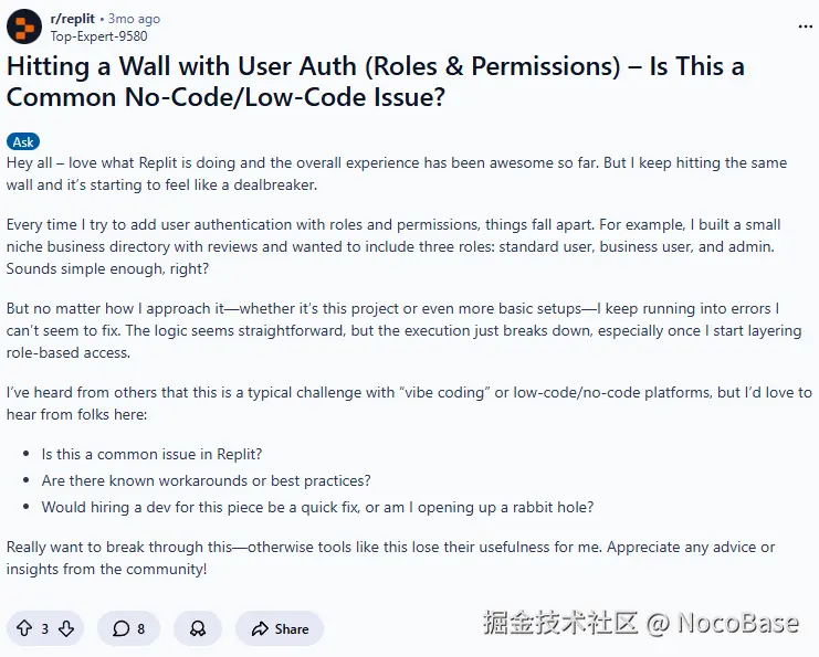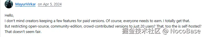 - 用户评价 :Budibase 的官方 GitHub 讨论里,用户普遍认可其"功能完整且开源",特别是自托管部署和内置的 RBAC 模块。但同时也有人指出,免费版本虽然标称开源,但对自托管用户存在人数限制(最多 20 用户),与官方宣传的"完全开放"存在落差。